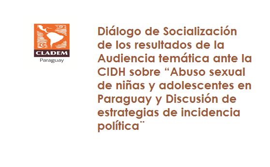 El diálogo de socialización de los resultados de la audiencia temática ante la CIDH sobre “Abuso sexual de niñas y adolescentes en Paraguay y Discusión de estrategias de incidencia política¨ tendrá lugar el miércoles 25 de mayo, a las 10 horas (AM), en el Museo de las Memorias (Chile 1066, entre Jejuí y Manduvirá) en Asunción.